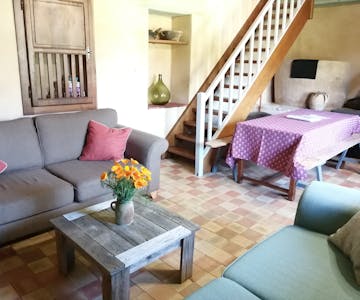 South facing, with a view onto the swimming pool, the gite is composed, on the ground floor, of a main living room of 32m² fitted out in the bread oven part. A staircase leads upstairs to the bedroom with one double bed (160X200) and two single beds (90X190), with an ensuite shower room. The kitchen (6m²) is accessible from the outside. There is a dining table in the main living area and a picnic table outside the front door for al fresco dinging.